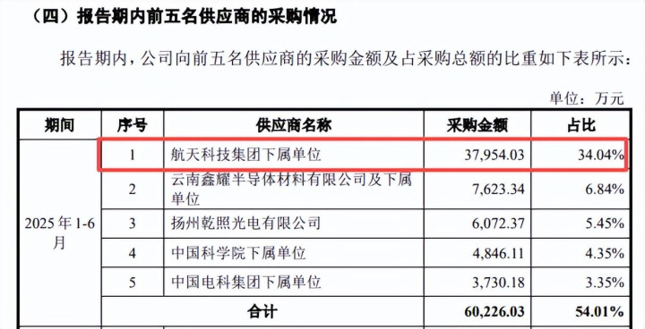 2025年1-6月电科蓝天联系来去占比拟高主要系公司对航天科技集团、中国科学院等航天总体单元客户的居品录用主要辘集鄙人半年,因季节性身分导致半年度联系来去占比阶段性升高,展望全年比例将裁汰。